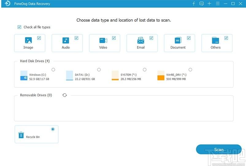 下载并安装后,在您的PC上运行FoneDogDataRecovery。在软件的主页上,您可以选择要从中检索已删除的特定数据的设备。例如,如果您要从回收站中恢复丢失的图像,则应在此页面上勾选“图像”和“回收站”中的选项。注意:在从可移动驱动器恢复已删除的数据时,最好保持计算机与可移动驱动器之间的稳定连接。